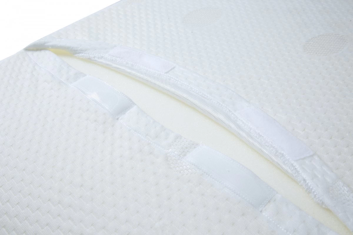Daarnaast heeft het reflux kussen twee kleinere steunkussentjes om je kindje in zijn/haar rug en buik te ondersteunen wanneer je kleine op zijn/haar zij ligt. Dit voorkomt tevens vervorming van het hoofdje. Het kussen is 63 x 43 cm en heeft een afneembare hoes die wasbaar is op 30°C.