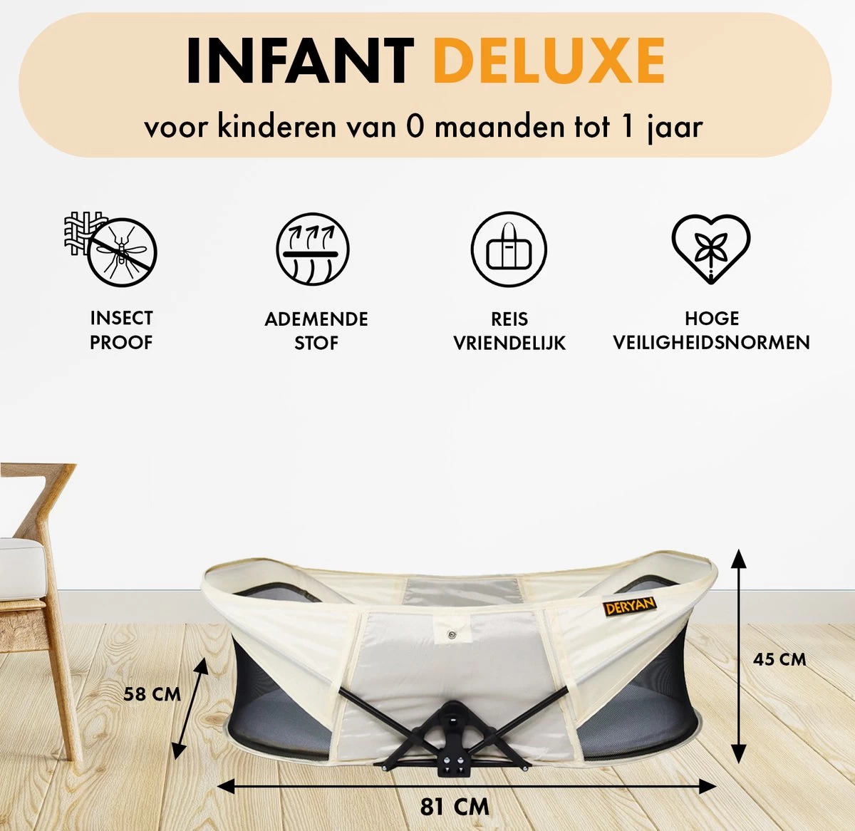 De Deryan Infant Deluxe is een absolute oplossing en vervanging voor onhandige en zware reis- of campingbedden. De Infant Deluxe bevat een stevig aluminium framewerk met tweezijdig slotsysteem.