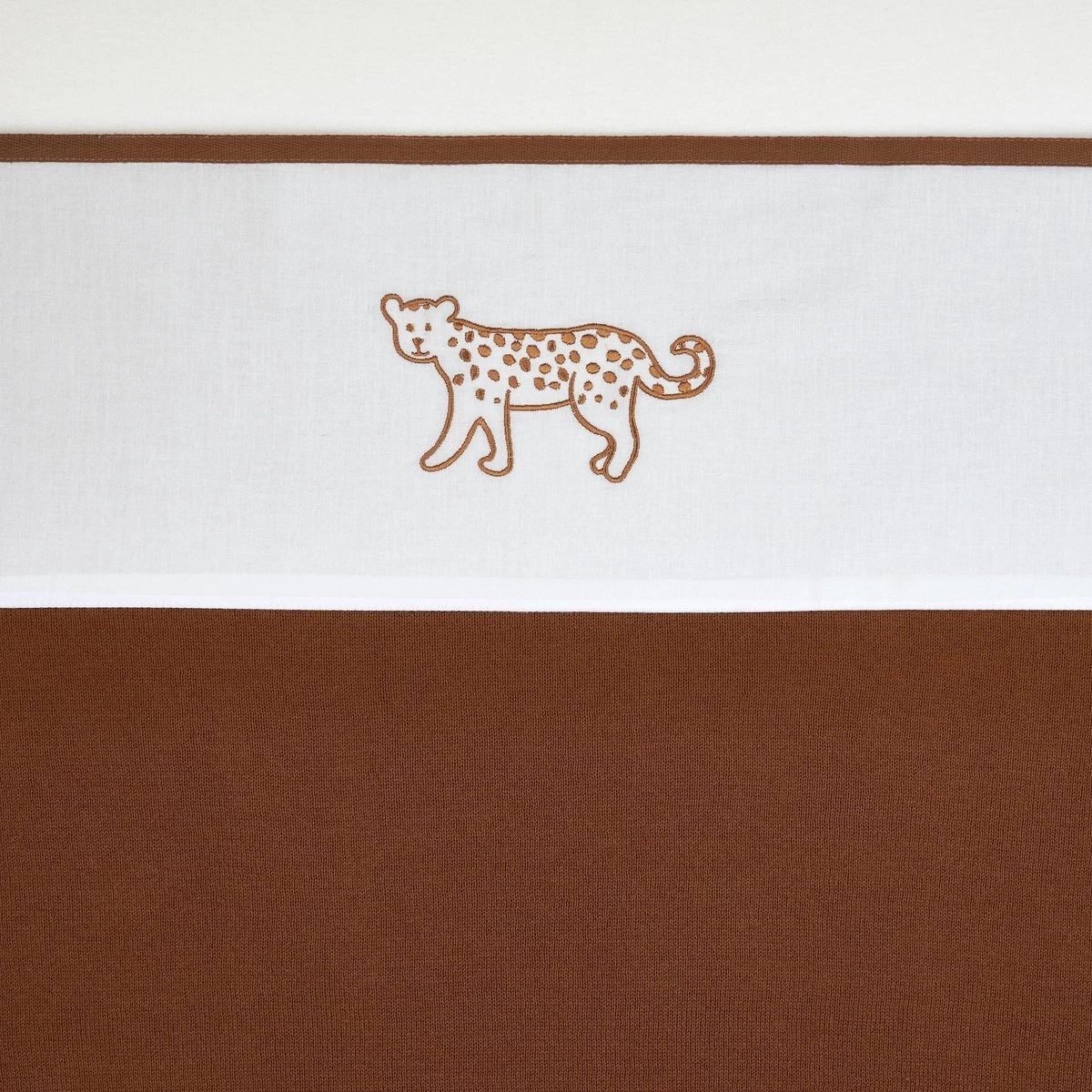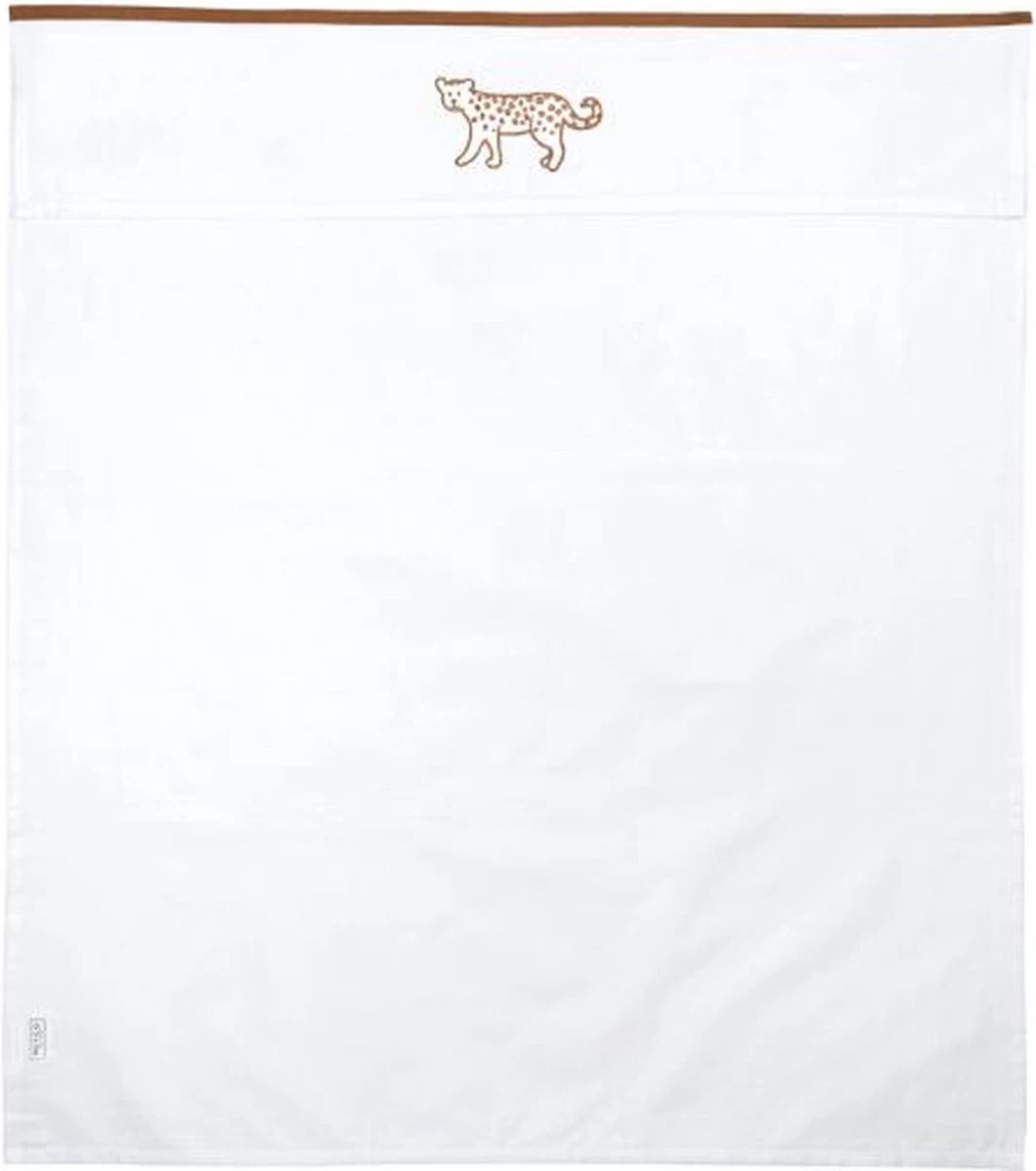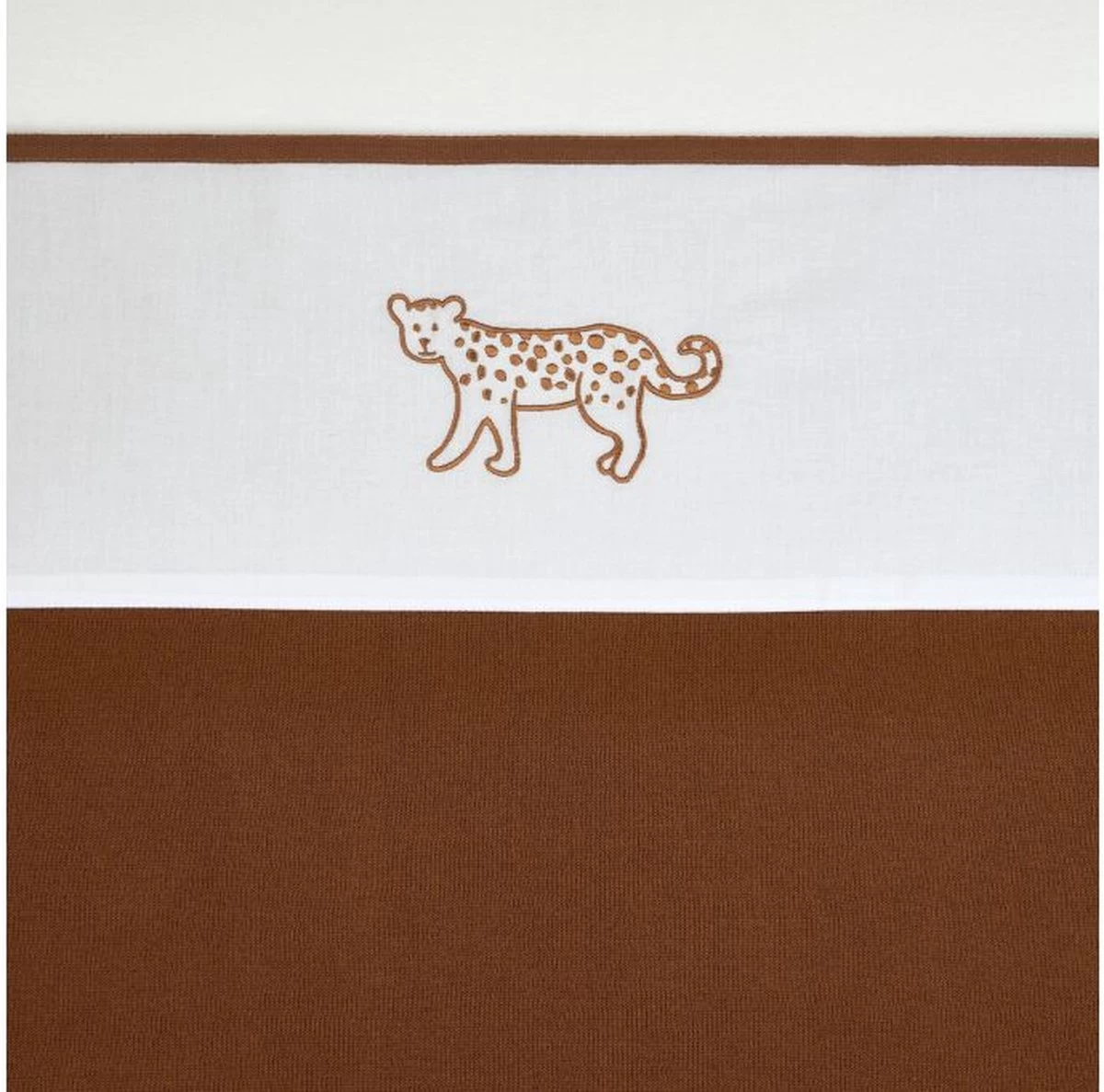 Een heerlijk zacht lakentje van 100% katoen. Door het gebruik van 100% katoen is het lakentje goed ademend en veilig, maar vooral comfortabel om onder te slapen. Het witte laken is voorzien van een gekleurde bies en geborduurde cheetah.