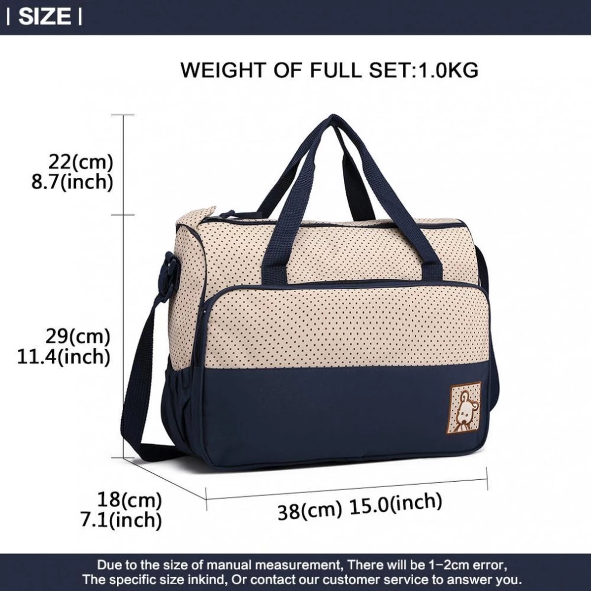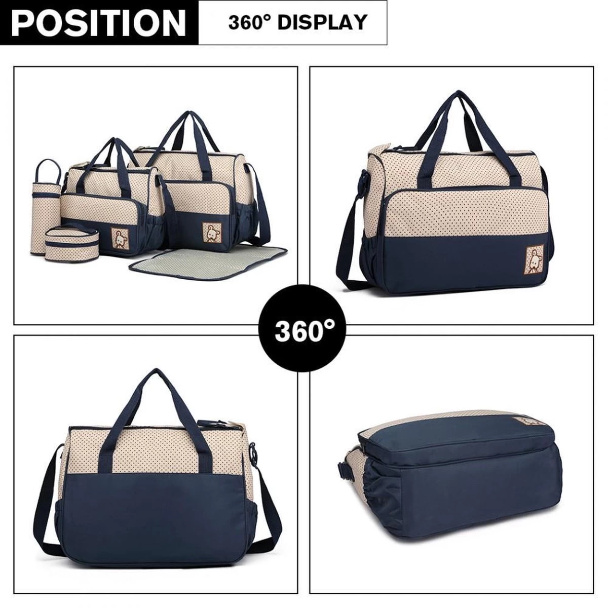 Deze complete Miss Lulu luiertas set is ideaal voor onderweg. Een compacte en functionele set met een 2 verschillende formaten luiertassen inclusief verschoonmatje voor je baby en een tasje voor de fles en het eten. Deze complete, betaalbare luiertas set mag niet ontbreken in je baby uitzet! Met 5 verschillende tassen is de verzorgingstas gemakkelijk te organiseren, super handig in gebruik en biedt werkelijk een zee van ruimte. Denk aan luiers, flesjes, babyvoeding, speentjes, slabbetjes en rompertjes, voor werkelijk alles is een plekje. De 5-delige set is gemaakt van hoogwaardig waterafstotend polyester, heeft een stijlvol design en gaat de gehele luiertijd mee! Of je nou boodschappen gaat doen, op een speelafspraakje gaat of een dagje weg; deze veelzijdige tas komt altijd van pas!