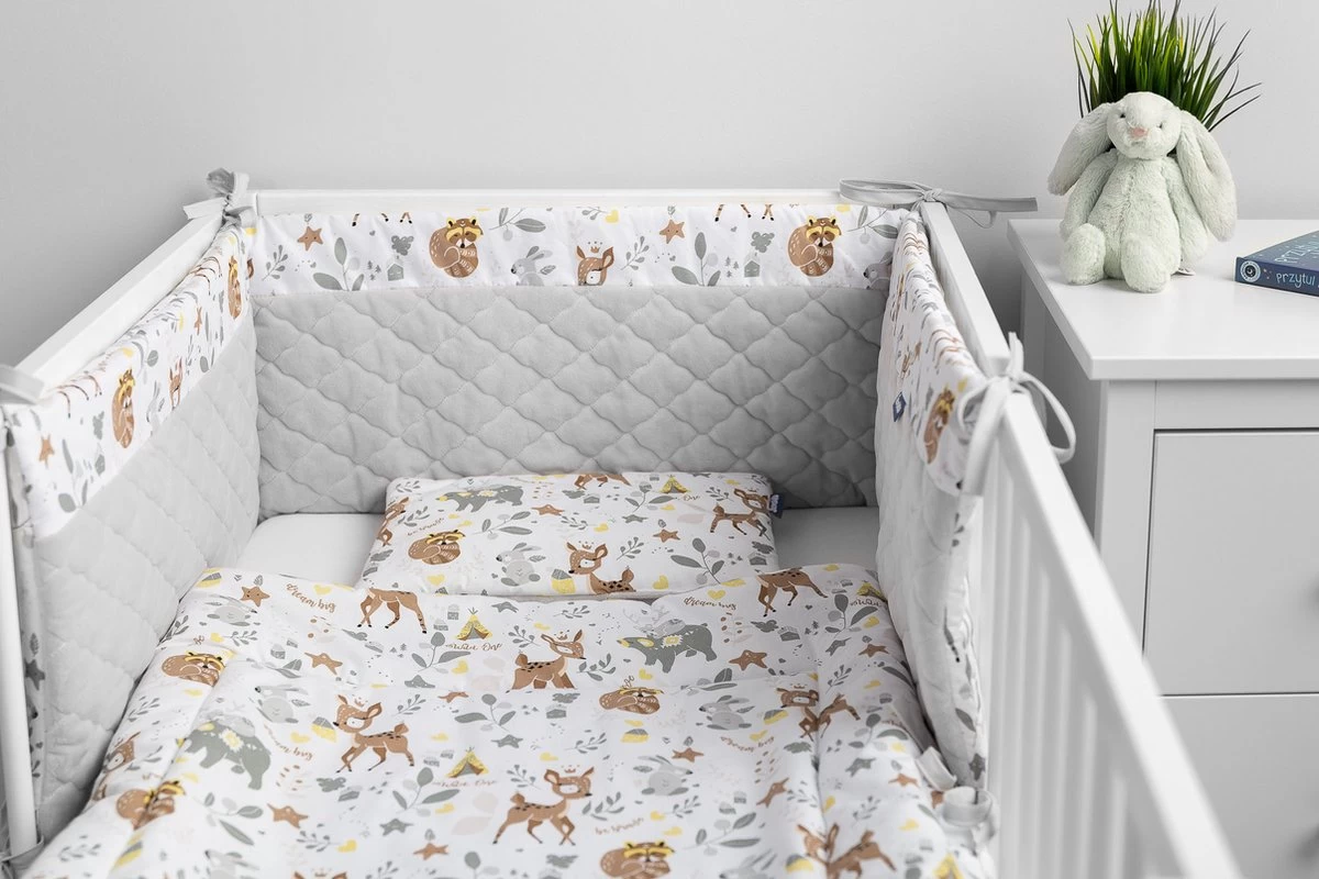 De bedbumper van Sensillo Baby is een perfecte aanvulling op de babyuitzet. De wattenvulling beschermt het kind tegen verwondingen tijdens het bewegen rond het bed en scheidt zich van de koude muur, de mooie materialen versieren de babykamer. De ene kant van de beschermer is gemaakt van zacht katoen met een print en de andere kant is van hoogwaardig, zacht aanvoelend pluche. Doormiddel van koort bevestigingen wordt de bumper in de juiste positie gehouden. De bedbumper is ontworpen voor een bed met een afmeting van 120×60 cm.