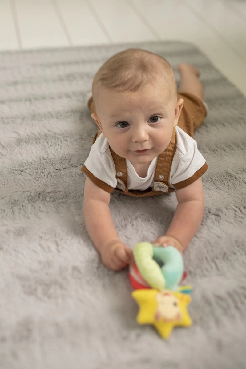 Zacht en speels voor het grootste plezier van baby! Felle kleuren en verschillende motieven om het zicht van baby te stimuleren. De zachte en verschillende texturen zorgen ervoor dat de rammelaar heel prettig aanvoelt. Een plastic ring om mee te rammelen en te zien hoe de gekleurde balletjes tegen elkaar botsen.